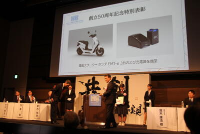 本田技研工業(株)の貝原副社長から副賞(EM1:e 3台)の目録をいただきました。