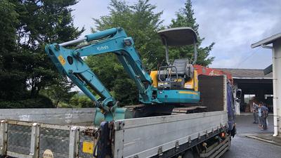 本校のホイールローダとバックホウを積み込み、芦北高校に運びました。