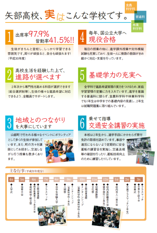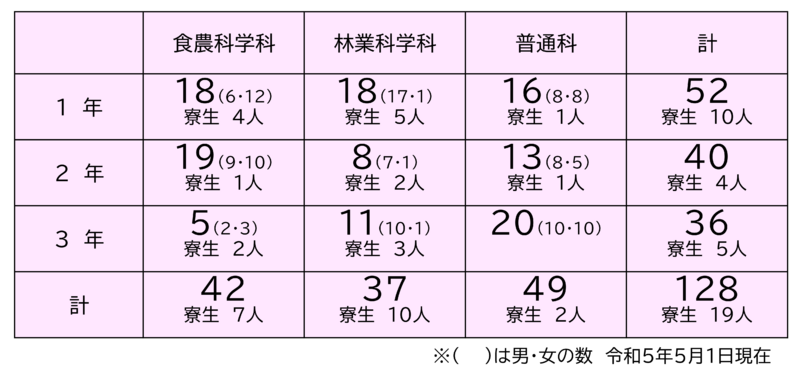本校は食農科学科、林業科学科、普通科の3学科3クラスの小規模校です。