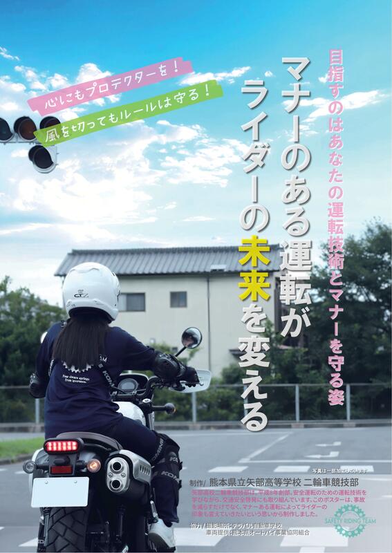 二輪車競技部では、安全運転やマナーを守った運転を広く呼びかける活動も行っていますその一環として、今回初めて交通安全啓発ポスターの制作に取り組みました。ポスターは、プロテクターを着用した二輪車競技部の部員が横断歩道の手前で一時停止している構図で、マナーを守った運転を呼びかける内容となっています。県内の各警察署や山都町内の観光施設に掲示しています