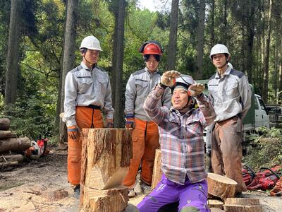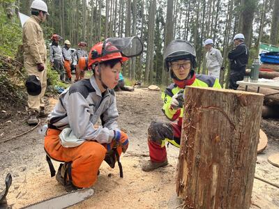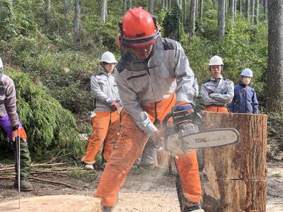 チェンソーの安全な扱い方や伐倒の基本を学び、実際に木を切る研修も