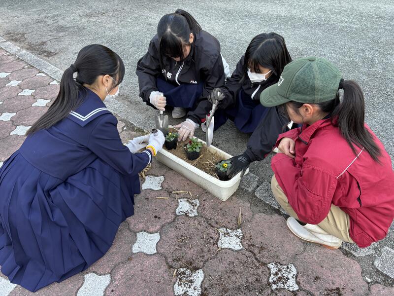 矢部高校で育てたビオラをプランターに植えつけました。高校生が先生となって中学生に植え方を教えながら一緒に植えました。プランターは矢部中学校で飾ってもらいます。