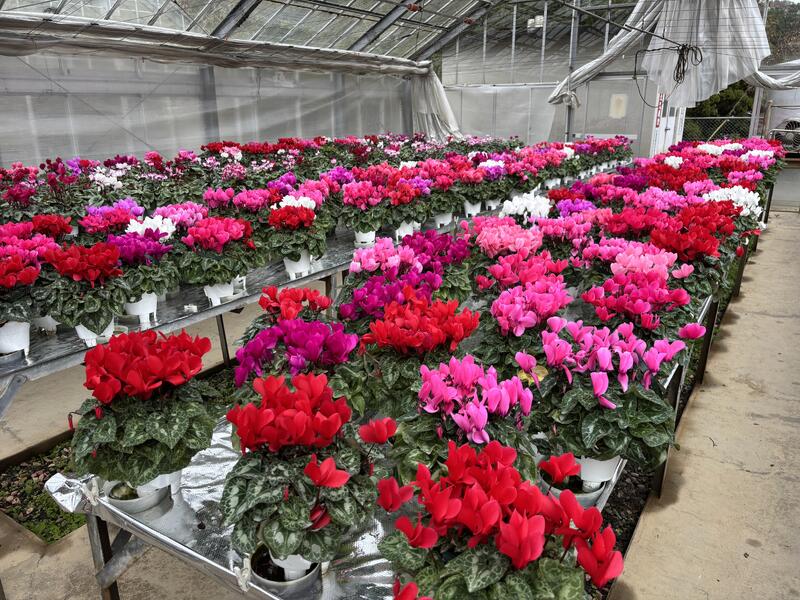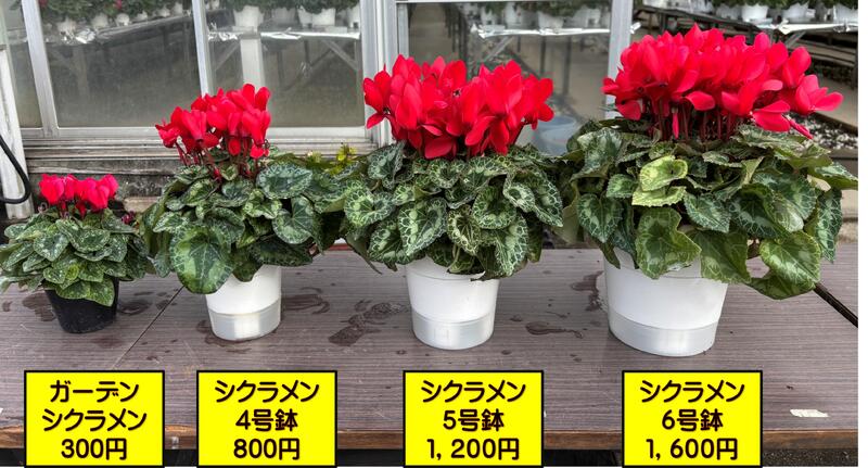 値段は6号鉢1,600円、5号鉢1,200円、4号鉢800円、ガーデンシクラメン300円です。