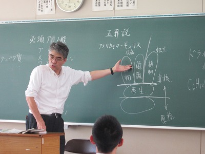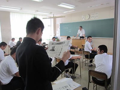新聞各紙を読み比べながら、生徒たちに説明されている様子。