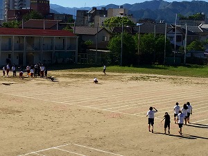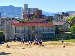 しかし、体力テストと身体計測の監督で、校舎全景と鮮やかな空を