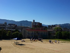 しかし、体力テストと身体計測の監督で、校舎全景と鮮やかな空を