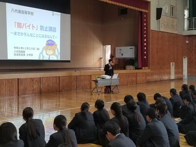 12月20日(金)、闇バイト防止講話を実施しました。講話では、八代警察署生活安全課少年係矢津田様を講師としてお招きし、具体的な事例を交えながらいわゆる「闇バイト」の危険性や対策についてお話しいただきました。生徒達は、身近な問題として真剣に講話を聞き入っていました。矢津田様、貴重な講話ありがとうございました。