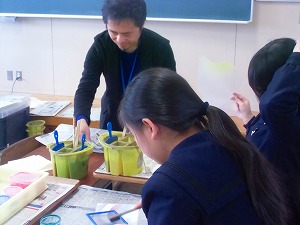 新聞各紙を読み比べながら、生徒たちに説明されている様子。
