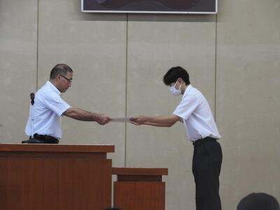 八代市青少年友好派遣団に本校1年の平野さんが参加することになり、同窓会から支援金を受け取りました。しっかりと八代市の代表として頑張ってきてください。