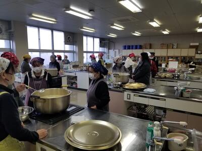 2日目の家庭科室の様子。学校の家庭科室で朝早くから準備を行いました。