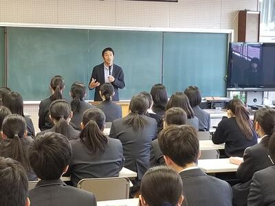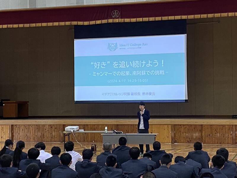 4月17日 専門学校イデアITカレッジ阿蘇・副校長の鈴木俊良様より「“好き”を追い続けよう!」というタイトルで1年生に向けて御講演をいただきました。①やりたいことが見つからないことは当たり前、まずは人から感謝される体験を若いうちに積み重ねることが大切。その結果、自分の軸が見えてくる ②なぜ?おかしくない?と感じたときに反発するだけでなく、その解決に向けて動いたり、その解決を仕事にしてみたりする などのお話をいただきました。生徒一人ひとりが講演をリフレーミングして、価値を見出してくれるといいなと思います。