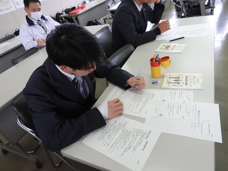 先輩方からいただいた受験体験記を読み、気づきをワークシートにまとめました。今回は関西外国語大学、九州中央リハビリテーション学院看護学科に進学する先輩、JASM株式会社(製造職)、横場工業(事務職)に就職する先輩の体験記を読みました。受験合格に向けた取組や学校生活の過ごし方を知るとともに、応募前職場見学や受験制度について知る機会にもなりました。個人的には「自分の進路は自分が行けそうなところではなく、自分が行きたいところを目指してほしい」という文言が印象に残りました。