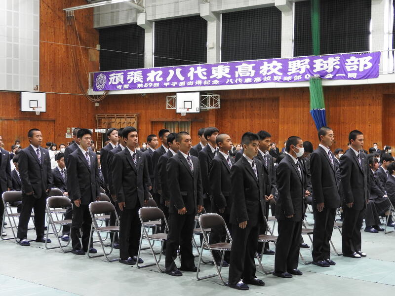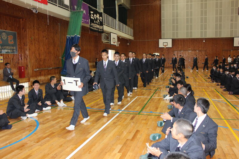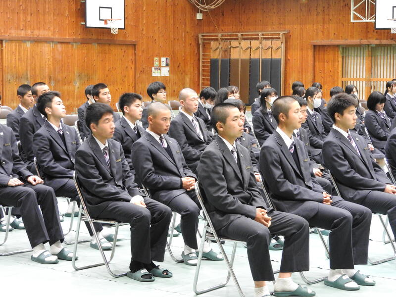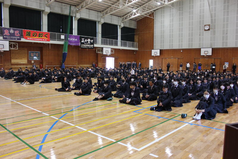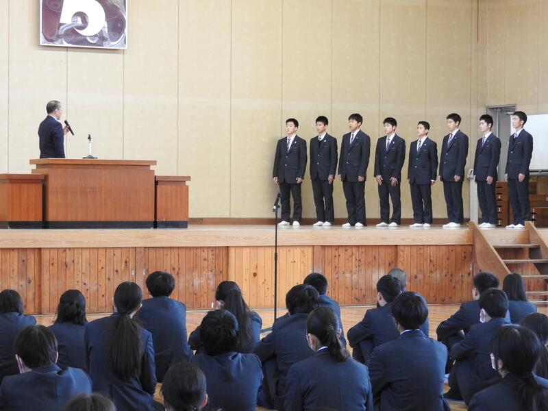 3月24日から滋賀県で開催されます、令和5年度第52回全国高等学校選抜バドミントン大会に出場する男子バドミントン部を全校生徒で激励するため、推戴式が行われました。選抜大会の出場は16年連続、28回目となります。生徒の頑張りを期待しています。