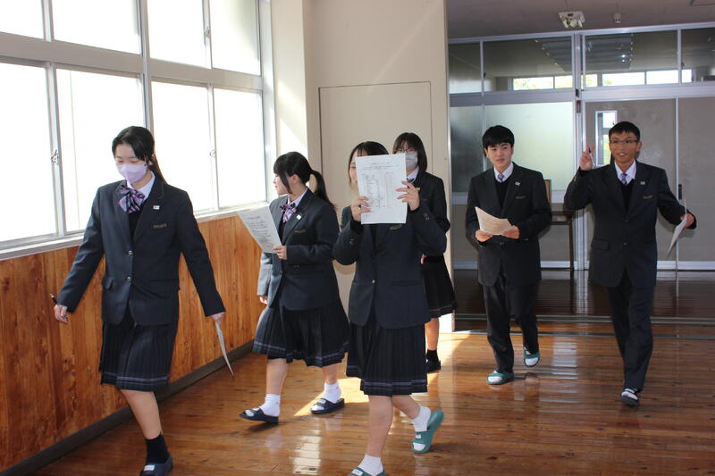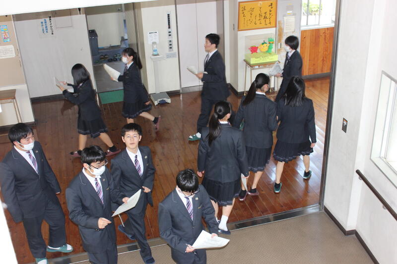 その後は、1・2・3年生でグループを作り、生徒会主催の校内ウォークラリーを実施しました。各教室に隠されている文字を並べ、クイズに答えていました。学年の垣根を越え協力し、楽しんでいる様子が見受けられました。