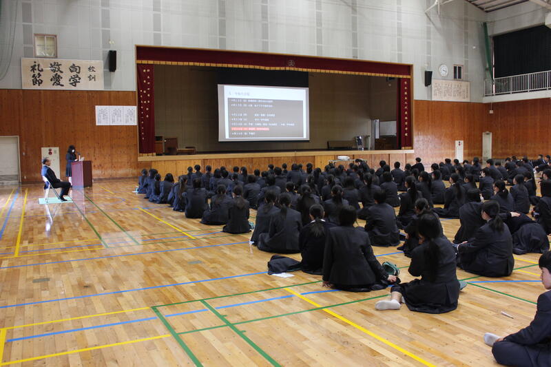 便利で身近になったスマートフォンやタブレット端末。使い方一つで自分自身を危険にさらすこともあります。ルールやマナーについて正しい知識をより深めることと、SNSに関連した危険やトラブルを未然に防ぐための対処法を講話を通して改めて学習しました。あとは、講話の内容を理解し、実際に生徒たちが行動することを期待します。