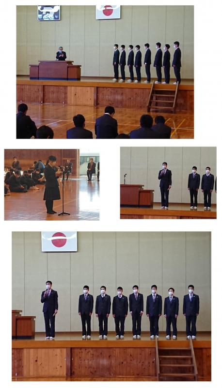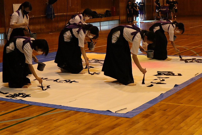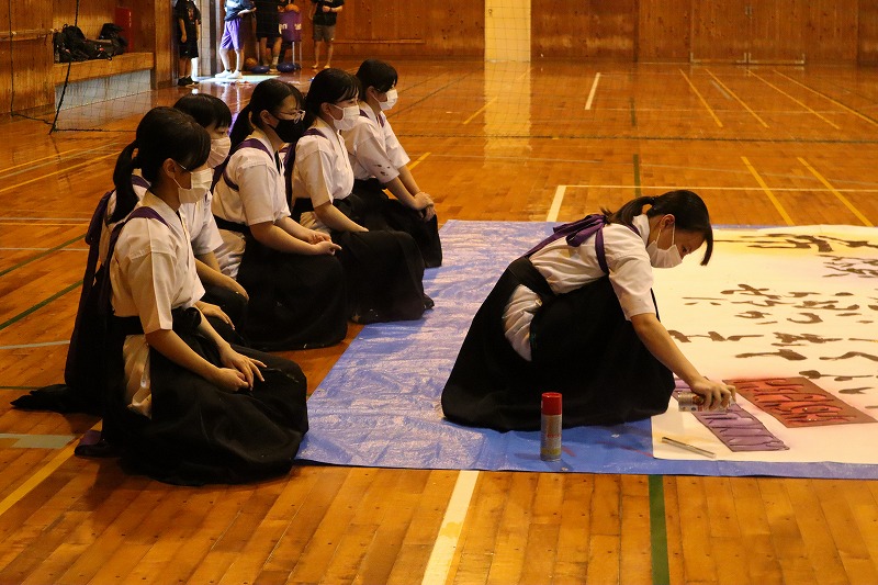 全校生徒が見守る中、音楽に合わせて、書道部の皆さんが大作を書き上げました。