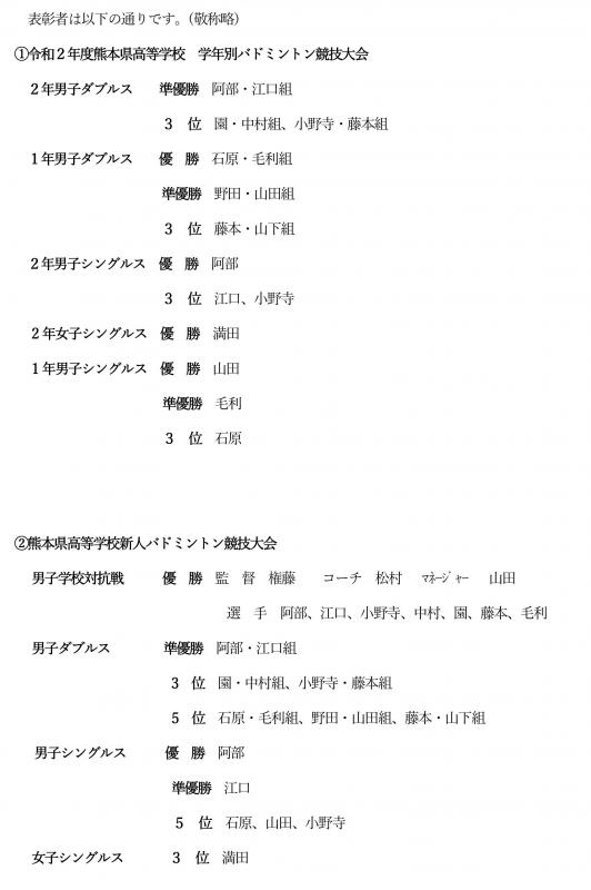 8月17~19日に行われました学年別バドミントン大会(個人対抗戦)に出場し、2・1年男子ダブルス・シングルス共に優勝しました。大雨と感染予防対策の中での大会でしたが、大会が実施されたこと、保護者同意のもと出場できたことに感謝し10月の新人戦でも頑張りたいと思います。大会結果は以下の通りです。応援、ありがとうございました。