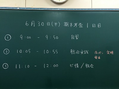 ある教室の前の黒板には、明日の考査の時間割が記載されていました。