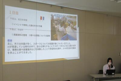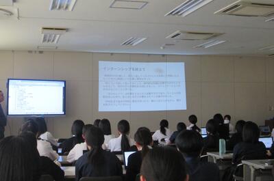 今年初の取り組みとして、7月23日(火)から25日(木)に行ったインターンシップの成果を事業所ごとにGoogleスライドを使ってスライドを作成し、インターンシップに参加した商業科、情報ネットワーク科全員で報告会を行いました。事業所の紹介、仕事内容、インターンシップで行ったこと、その中で学んだことなどを各グループが自分たちで色々な工夫をして報告を行いました。