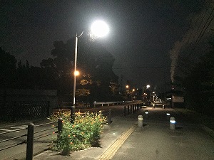 街灯のもと、コスモスと日本製紙さんの煙・・・