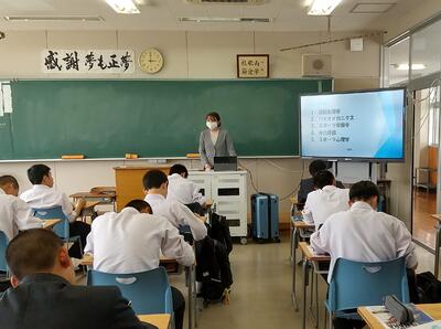 各学科(商業科、情報ネットワーク科、普通科スポーツコース)の専門教科の学びと社会・仕事とのつながりについて、県内専門学校より講師をお招きしてお話をいただきました。簿記の資格が生かせる仕事、IT業界、スポーツ分野の仕事、それぞれ学科毎に見分を広げることができました。専門教科の学習に益々励み、今回のお話をキャリアプラン構想のヒントにしてもらえるとうれしいです!