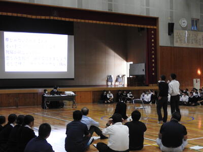 東高マーケットに向けて全校生徒で「社員総会」を行いました。マーケットリーダーを中心に接客7大用語と顧客対応を学習し、全校生徒をあげて東高マーケットの準備に取り組んています。