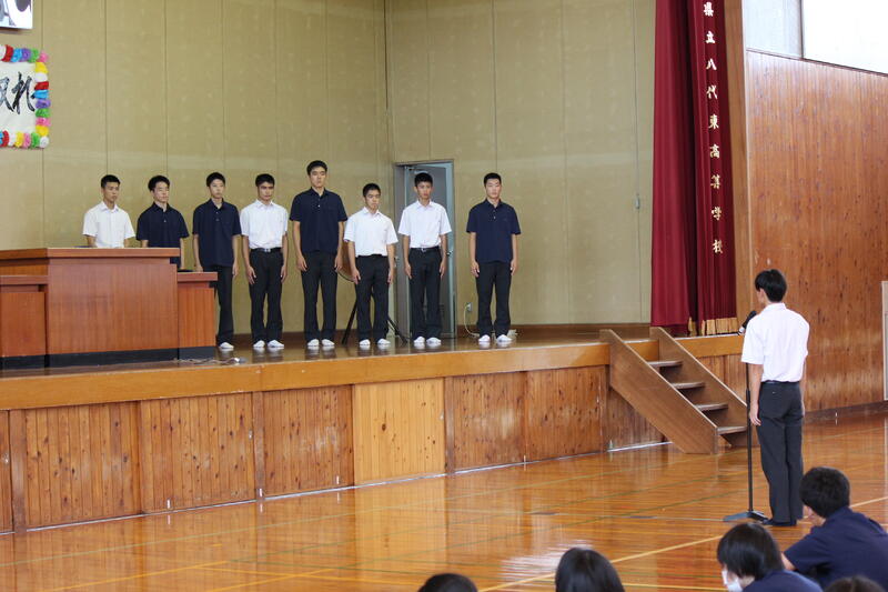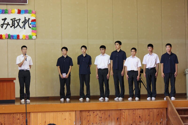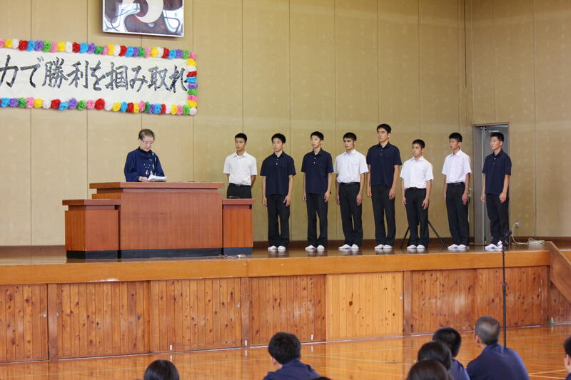 令和5年度 全国高等学校総合体育大会に出場する男子バドミントン部の推戴式を行いました。校長先生をはじめ同窓会からも激励のお言葉を頂き、選手を代表して主将の中村さんから決意表明がありました。日頃の成果を北海道の地で出し切ってきてください。
