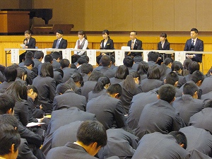 大学、短期大学、各種学校及び企業からの具体的な説明、講話を聞き、それぞれの生徒が自らの進路を考える契機とする。また、質疑応答を通して、生徒が自らの適性と希望進路の整合性を確認し、希望進路の決定に資する。