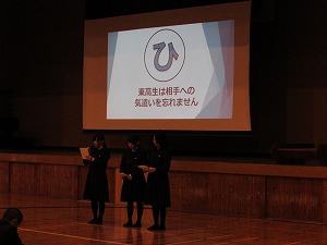 校内で携帯電話を使用する生徒が増えているという現状が見受けられるため、本校の携帯電話等規定について、今一度、生徒一人ひとりに自分のこととして考えさせる。また、使用する際のマナーについても確認し、情報モラルに対しての意識向上をはかる。