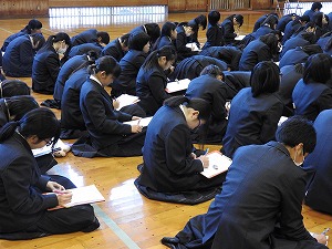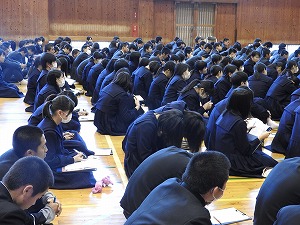 校内で携帯電話を使用する生徒が増えているという現状が見受けられるため、本校の携帯電話等規定について、今一度、生徒一人ひとりに自分のこととして考えさせる。また、使用する際のマナーについても確認し、情報モラルに対しての意識向上をはかる。