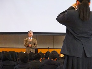 今年の元日の新聞各紙の一面は「主権者教育」と「ロボット」の特集が多かったという例を示され、元日の新聞からは世の中の動きをよく読みとることができること、節目を大切にし、熊本地震以降の動向を含め、将来社会に出たときに対応できるよう視野を広く持つことが大切であることなどについての講話がありました