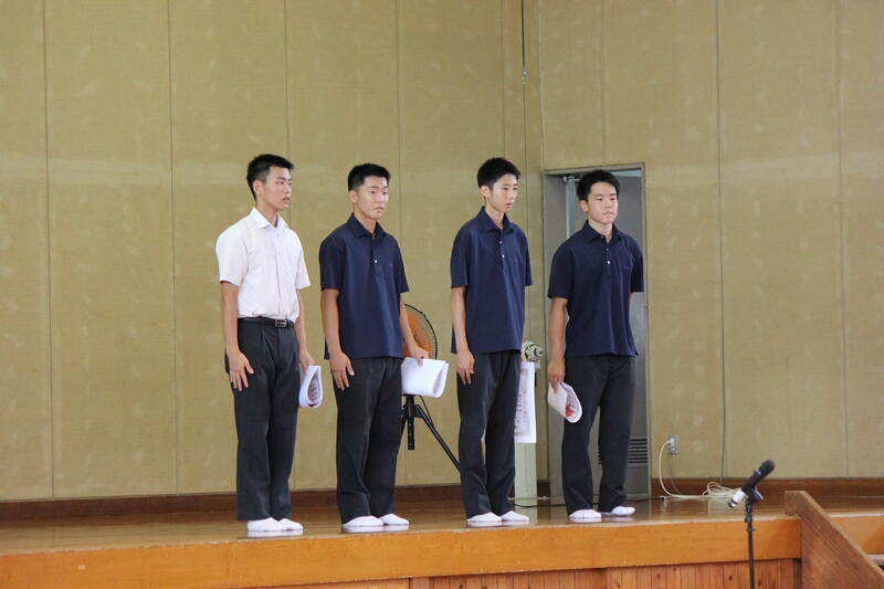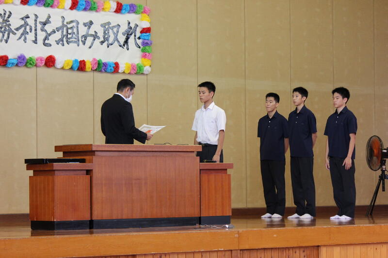令和5年度 全国高等学校総合体育大会に出場する男子バドミントン部の推戴式を行いました。校長先生をはじめ同窓会からも激励のお言葉を頂き、選手を代表して主将の中村さんから決意表明がありました。日頃の成果を北海道の地で出し切ってきてください。