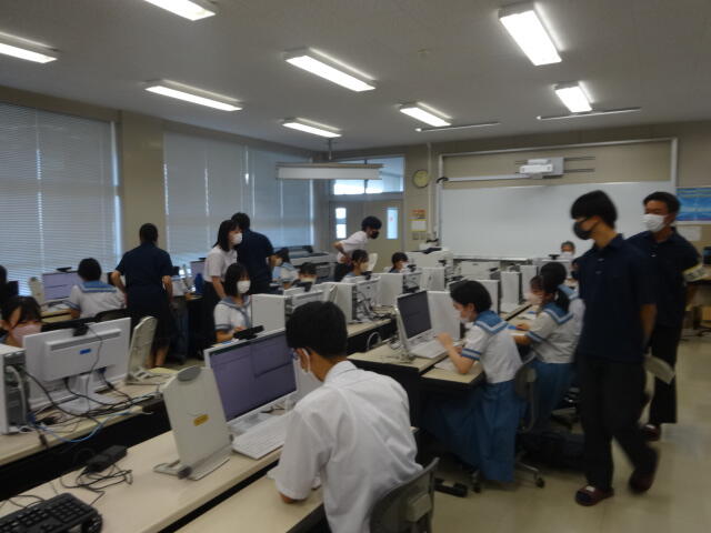開校式の後に、本校の設置学科である3学科(商業科、情報ネットワーク科と普通科スポーツコース)の専門授業について体験や見学をし、その後部活動を見学するという流れで実施しました。短い時間ではありましたが、中学生のみなさんは、大変興味を持って取り組んでくださいました。