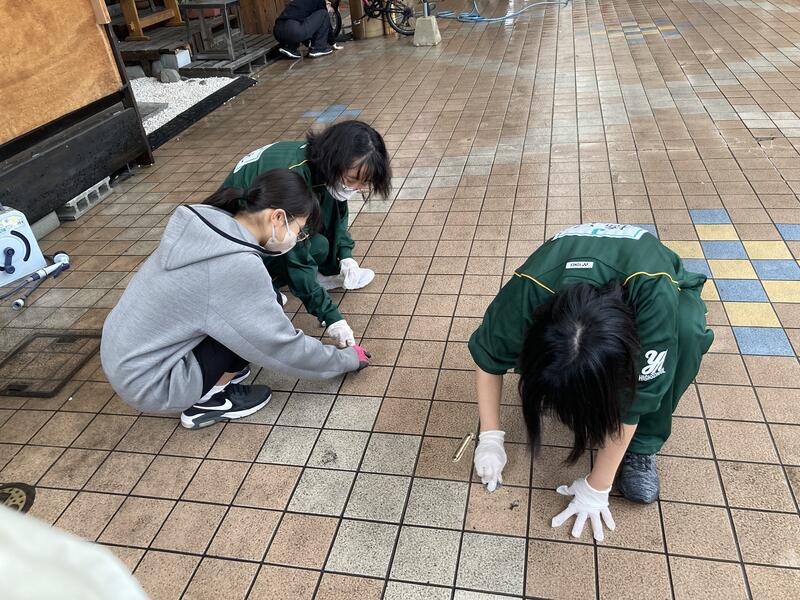 アーケードの床面のガム汚れはがし、なかなか取れなくて大変ですが、参加者の皆さんと一緒に、一生懸命作業をしました。