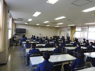9月30日6限、2年生を対象に産業講話が行われました。県内にどのような企業があるのか、その企業の中から志望先を絞り込む方法、県内就職の魅力について学びました。卒業生が活躍しているJASM、YKKAP、九州FCC、テラプローブの紹介もありました。
