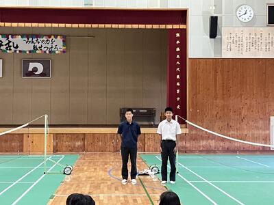 佐賀県で行われます「国民スポーツ大会2024バドミントン競技少年の部」に本校から3名の生徒が出場するにあたり、激励会が行われました。熊本県代表として頑張ってきてください。