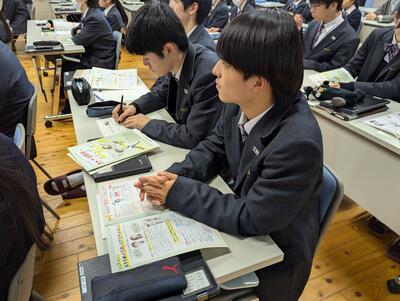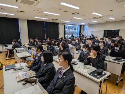 この講義に参加した商業科1年生は、真剣な表情で話を聞いていました。感想では、「商業を学ぶことの楽しさを改めて実感した。」・「簿記会計は、社会人として求められる重要なスキルの一つであることがわかった」など、日頃学んでいる授業の重要性を知るよいきっかけとなりました。