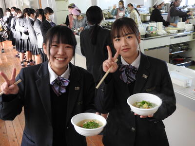 東高の恒例行事、「馳走会」が今年もやってきました。PTAの呼びかけで朝早くから保護者の方々が集まり、豚汁を作って昼食時に振る舞っていただきました。昨日の長距離走の疲れも吹っ飛ぶくらいの温かい豚汁とご飯に、生徒たちも大喜びの様子でした。