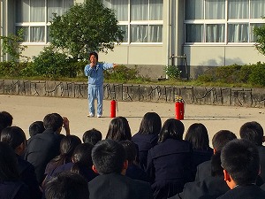 地震の放送直後の教室の様子です。 消火器の使い方のお話です。