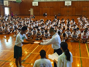 7月15日(金)に本校体育館にて7月の全校集会を行いました。集会の内容は表彰式とインターハイに出場する選手推戴式です。