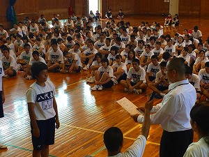 生徒全員、体育館と、グランドでは炎天下の中で、熱中症もなく、