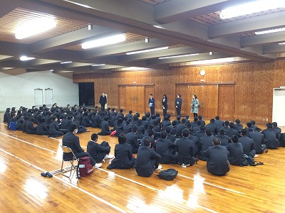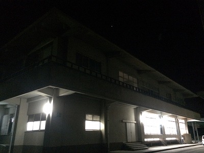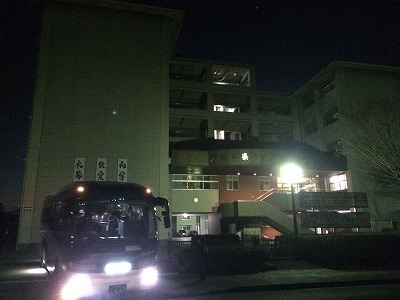 まだ暗い中をバスが出発!暗い中に光る校舎を見ることも、なかなかないですね。