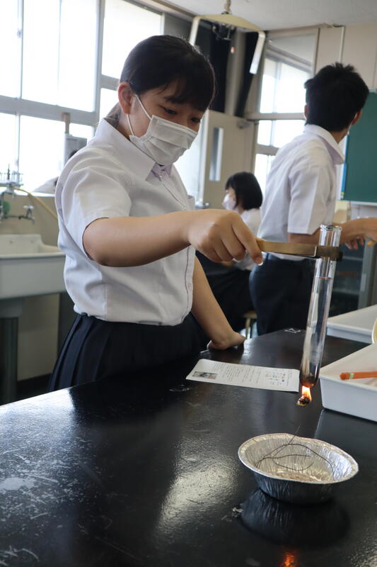 生物は有機物を分解してエネルギーをうみだし、様々な生命活動を行っています。本時は、実際に有機物(ピーナッツ)を分解してエネルギーを生み出すとともに、その大きさを実験的に求めました。生徒達はパソコンを用いてエネルギーの大きさを計算していました。情報の授業の知識を活用できています。実験大成功です。