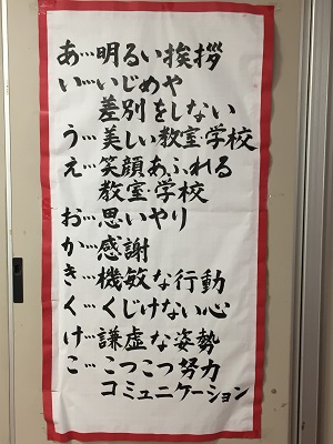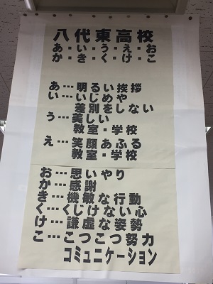 進路指導室には 、『八代東高校 「あ・い・う・え・お」 「か・き・く・け・こ」 』 が掲げられています。