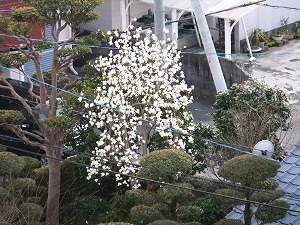 学校の近くに、こぶしの花でしょうか、きれいに咲いているのが見えます。