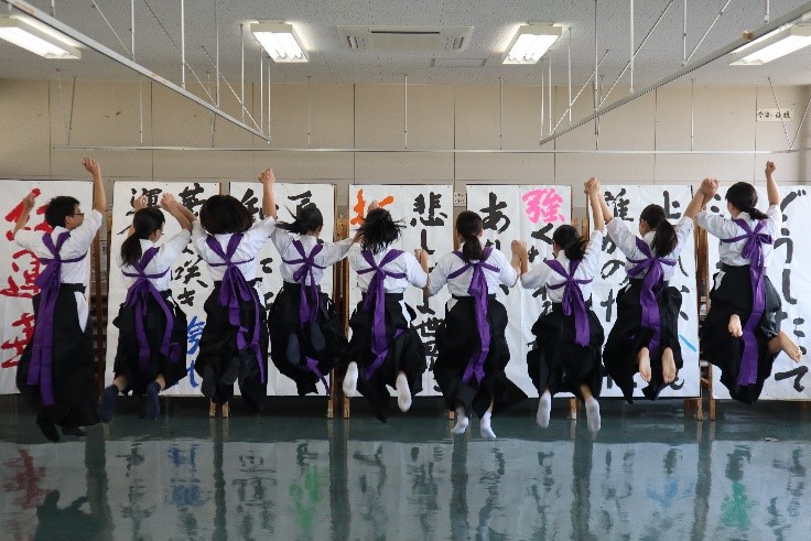 八代東高校書道部は、『一字一筆 日々努力』をモットーに、毎日練習を真剣に黙々と取組んでいますよ。