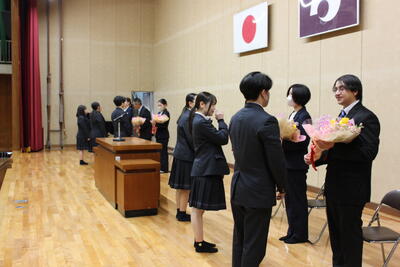 退任式では、これまで温かく見守ってくださった先生方へ、感謝の花束を贈りました。別れは寂しいものですが、先生方と過ごした思い出は、生徒たちの心に深く刻まれています。出会いと別れの季節。それぞれの新しい道が、光り輝くものであることを願っています。