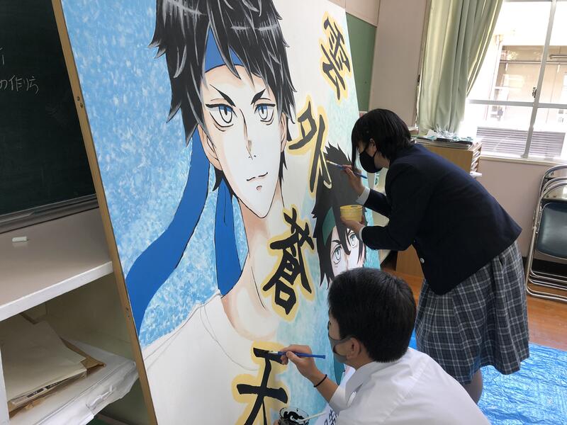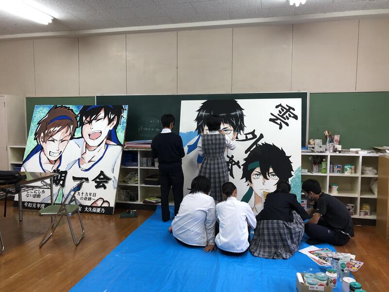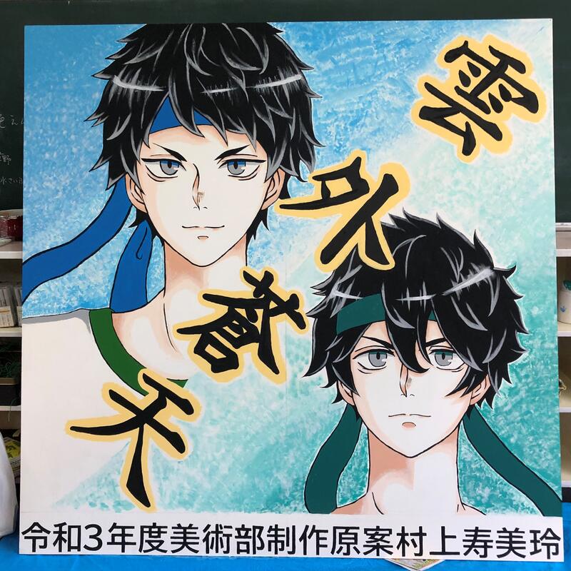 令和3年度体育大会の看板を美術部で制作しました。上は完成品、下は制作途中です。(下の写真の左隣は一昨年の看板です。)