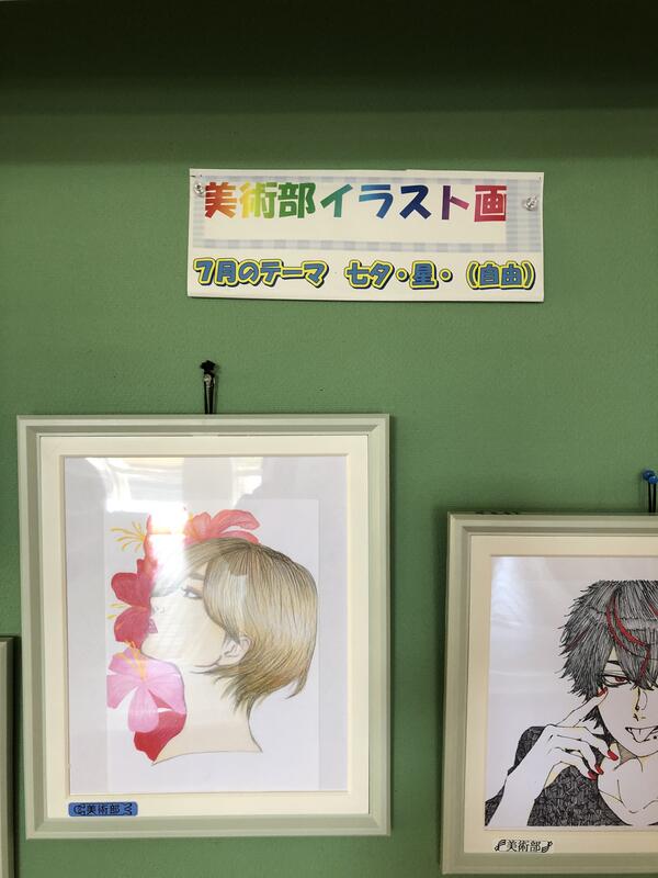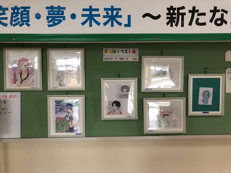 美術部は、基本的に毎週月曜日を活動日としています普段は個人的な製作活動が主体ですが、体育大会の看板制作などは全員で取り組んでいます。用紙や道具なども基本的にそろっています。2019年度は高校総体応援旗制作や世界女子ハンドボール応援旗など、部員全員で作画しました。毎月テーマを決めて、作品制作に取り組み、生徒昇降口前に展示しています。