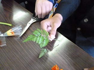 はじめにコサージュの作り方についてレクチャーを受け、その後、それぞれの学科に分かれ、製作しました